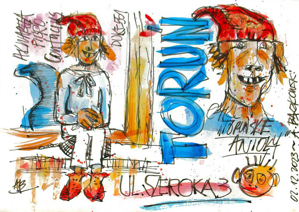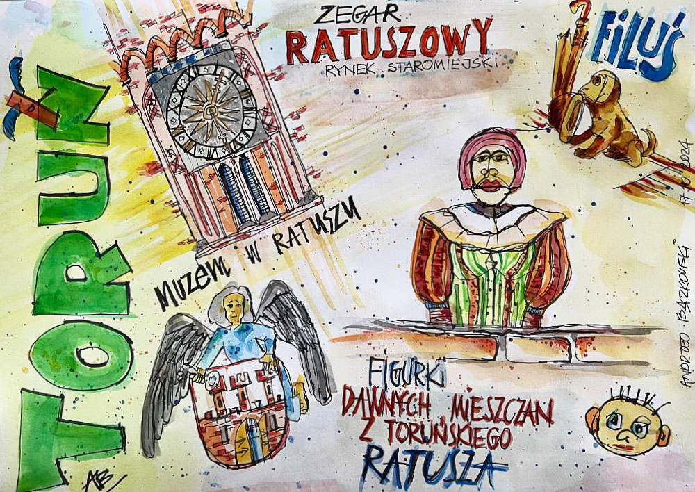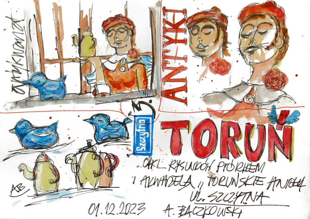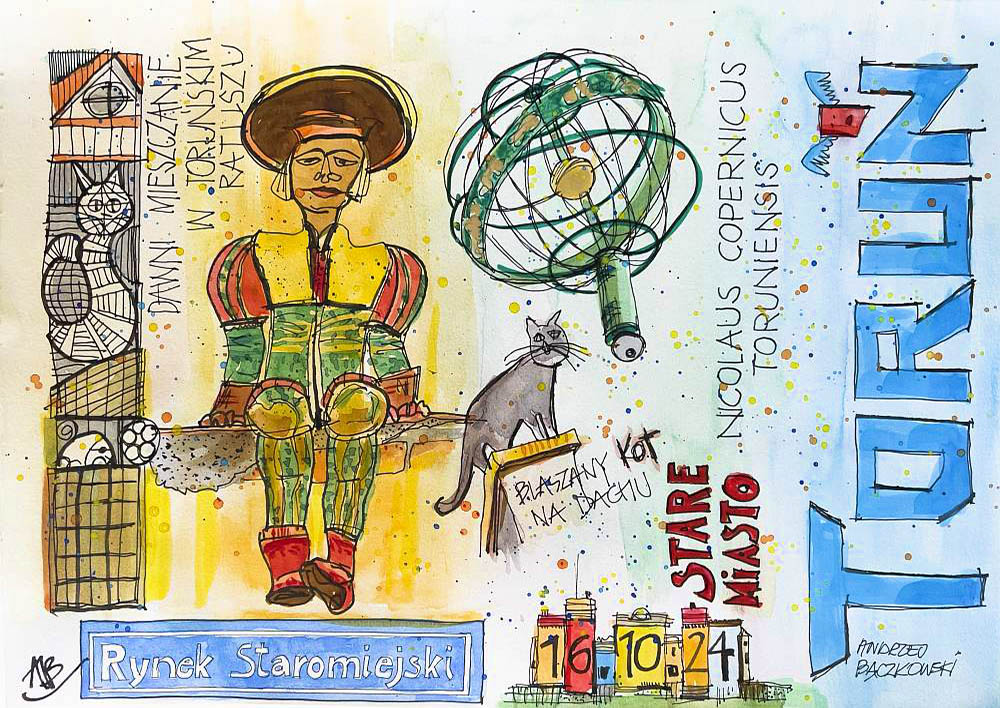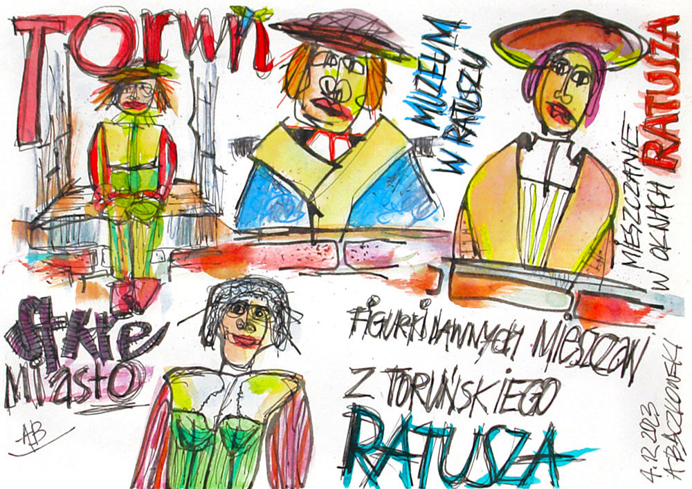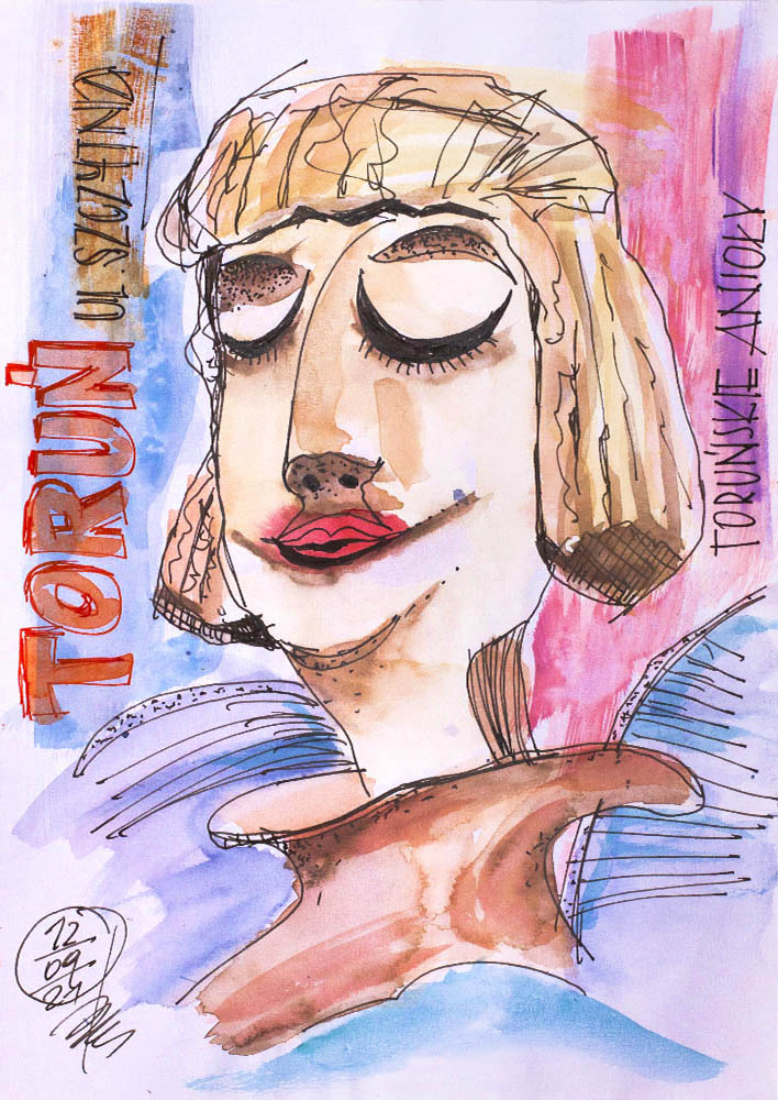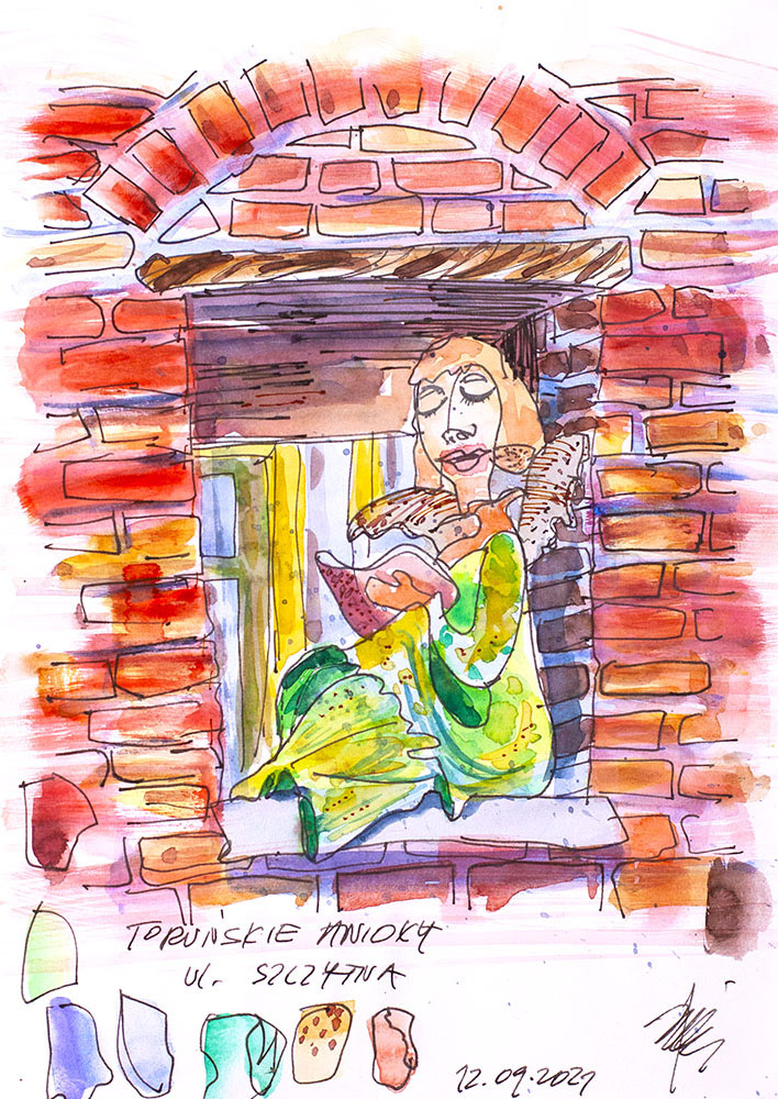 Anioły toruńskie akwarela Andrzej Bączkowski, zabawne akwarele, szkice, rysunki