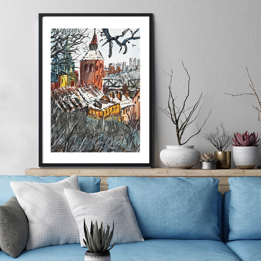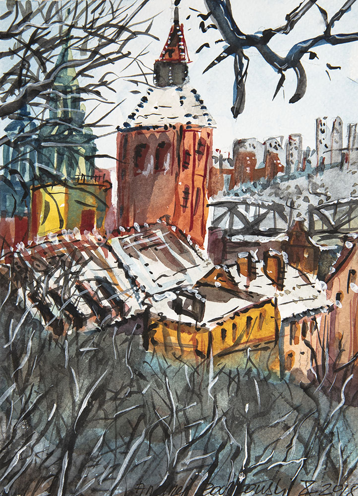 For almost 20 years I have been living in Bydgoszcz, Poland. Yet my hometown is Grudziadz, the town located in northern Poland at the Vistula River bank. I was born and raised there, so longing for the old and well known places is always alive in my heart. It is why I have painted ‘My Hometown’ watercolour painting and the town often appears in my art.