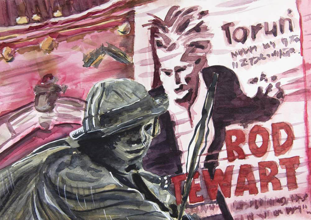 Watercolour painting depicting popular statue of a rafter located in the Old Square in Torun with a huge poster promoting Rod Stuart 2011 concert in background.