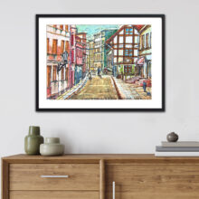 Watercolour painting depicts charming place in the city of Toruń, Poland. The street is located in the heart of Old Town in the city, close to the place where Nicolaus Copernicus was born.