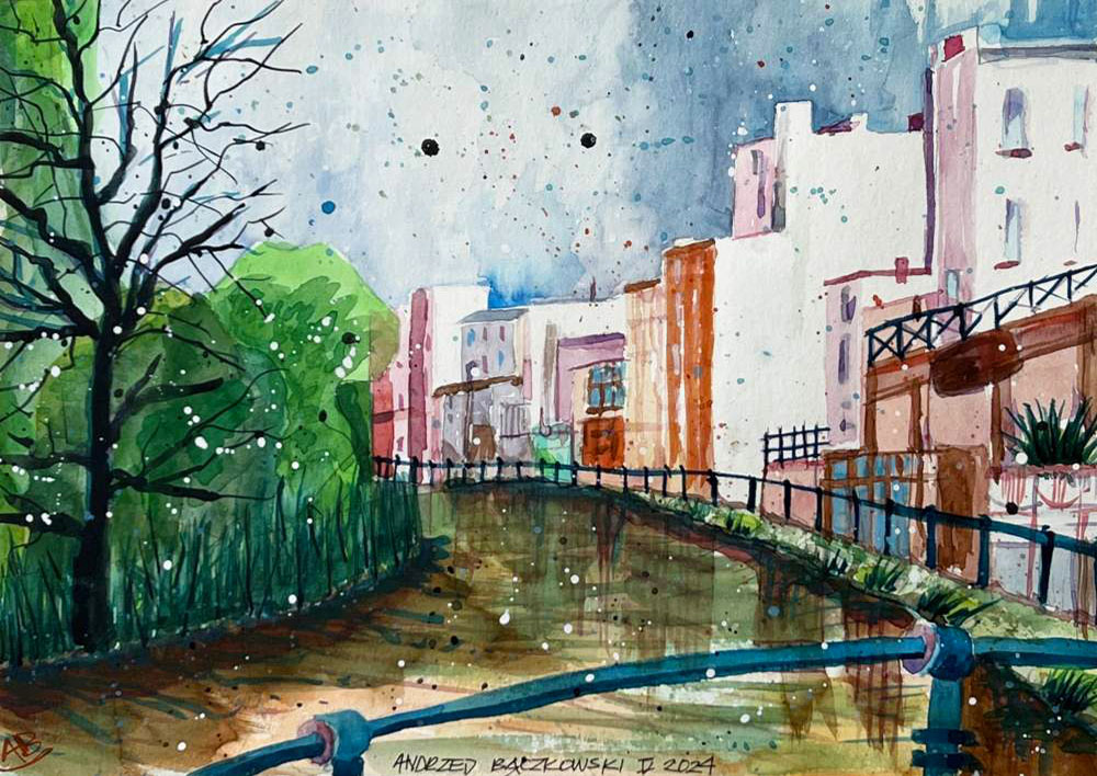 Watercolour painting ‘The Venice of Bydgoszcz’ depicts part of the Old Town in the Polish city where I live. The area is called Venice, because buildings there resemble Italian famous city. They are raising up as if straight from water of flowing the Młynówka River. In the past, rich burghers built in the area their plants and workshops and even a bathouse operated there.
