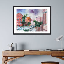 Watercolour painting ‘The Venice of Bydgoszcz’ depicts part of the Old Town in the Polish city where I live. The area is called Venice, because buildings there resemble Italian famous city. They are raising up as if straight from water of flowing the Młynówka River. In the past, rich burghers built in the area their plants and workshops and even a bathouse operated there.