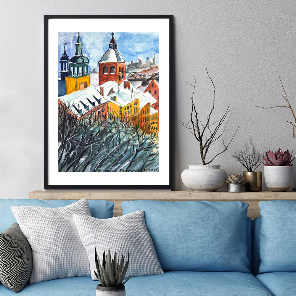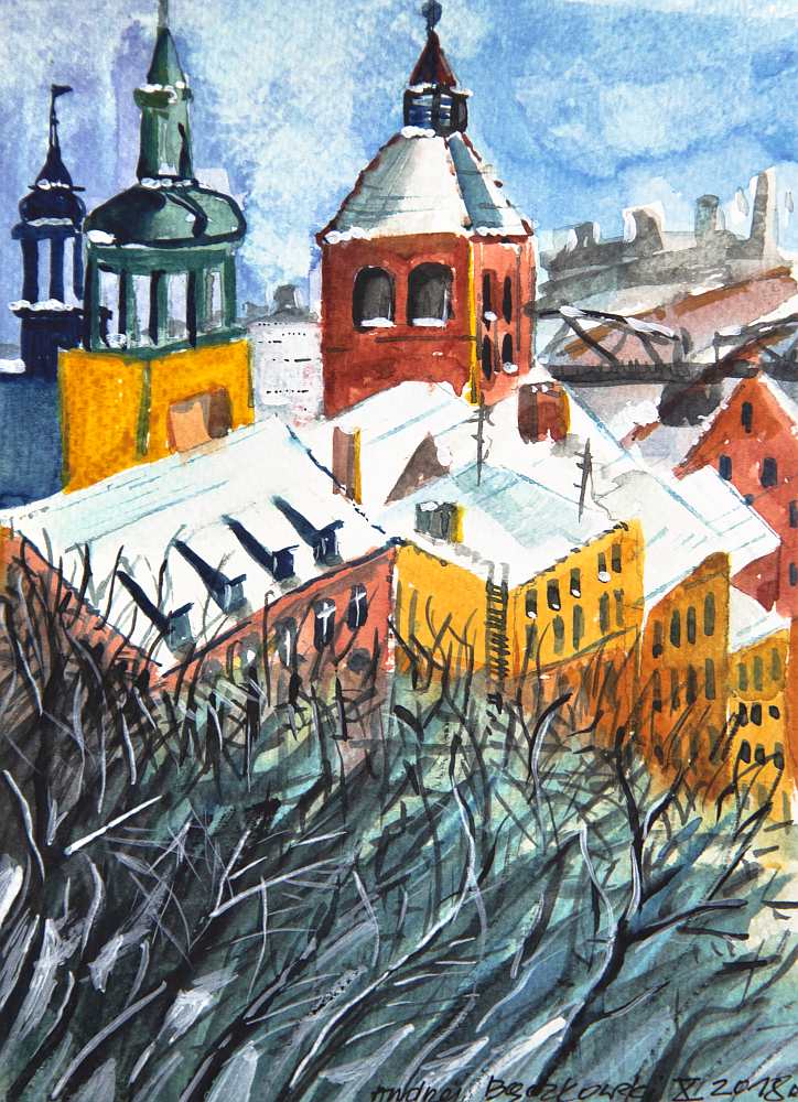 For almost 20 years I have been living in Bydgoszcz, Poland. Yet my hometown is Grudziadz, the town located in northern Poland at the Vistula River bank. I was born and raised there, so longing for the old and well known places is always alive in my heart. It is why I have painted ‘My Hometown’ watercolour painting and the town often appears in my art.
